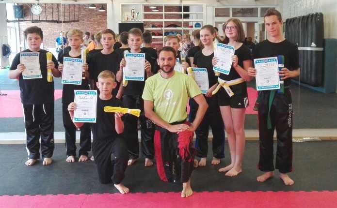 Bereits im Sommer 2017 haben 9 Kickboxer erfolgreich mit ihrem Trainer Waldemar Wentland die Gürtelprüfung abgelegt. Diese gliedert sich in 2 Teile. Zuerst kommt ein Technikteil, bei dem die Sportler unterschiedlichste Kickbox-Techniken zeigen müssen. Anschließend wird jeder in einer Kata geprüft, was eine feste Abfolge von Techniken ist.