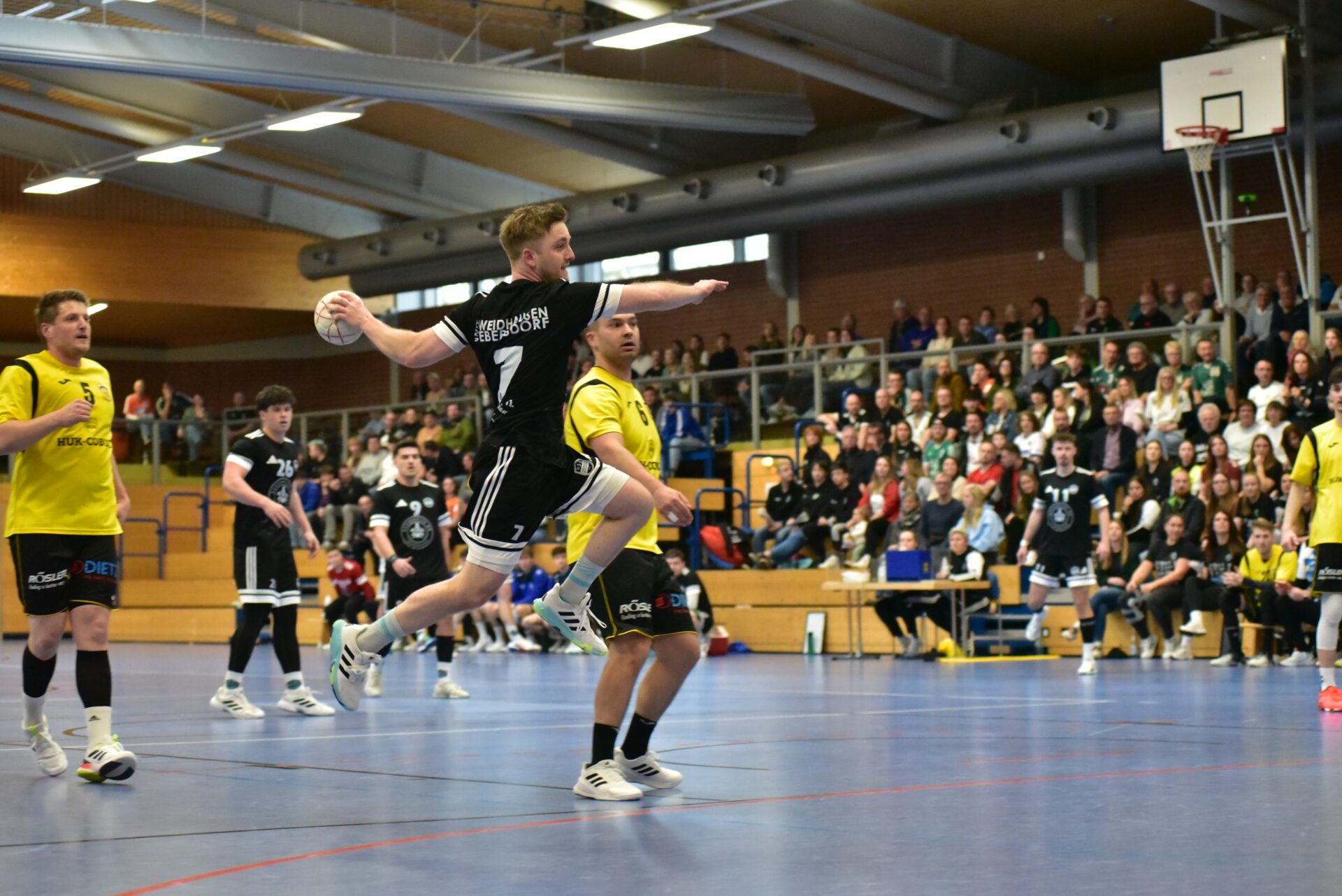 Was sich aber dann in der Frankenlandhalle abspielte, war ein wahrer Thriller und wäre von Alfred Hitchcock selbst nicht besser zu Papier gebracht worden – ganz zum Leid der HSG Fichtelgebirge, die vermutlich schon das kaltgestellte Bier geöffnet haben: Mit einer wahren Energieleistung der gesamten Mannschaft kämpften sich die Hausherren innerhalb von zwei Minuten auf 23:24 heran – die Halle tobte! Auch die sonst so abgeklärt spielenden Gäste wirkten nun etwas verunsichert, konnten aber nochmal zum 23:25 vorlegen.