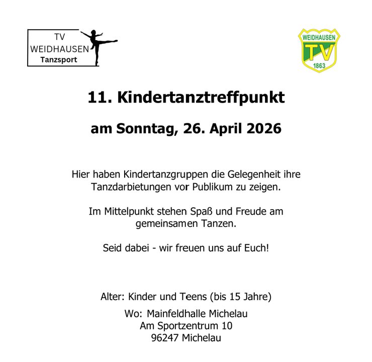 Am 26. April 2025 ist es wieder soweit! Der TV Weidhausen lädt herzlich zum 11. Kindertanztreffpunkt in der Mainfeldhalle Michelau ein.